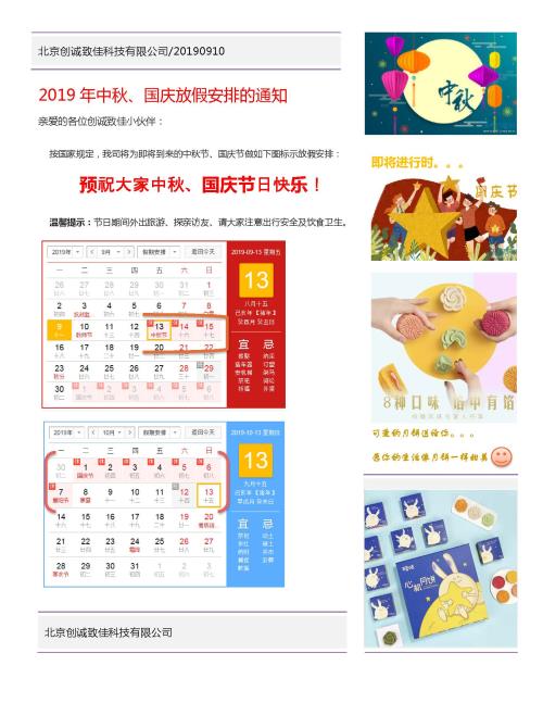 當(dāng)前位置:首頁(yè) >> 技術(shù)&動(dòng)態(tài) >> 新聞動(dòng)態(tài) >>創(chuàng)誠(chéng)致佳2019年中秋,國(guó)慶放假安排通知